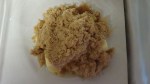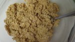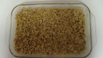 Meanwhile, cream butter and brown sugar in a large mixing bowl. Add the quick oatmeal, baking soda, and flour and blend together. Lightly grease a 9×13 pan. Put half of the oatmeal mixture in the bottom of the pan. Set the rest in the bowl aside.