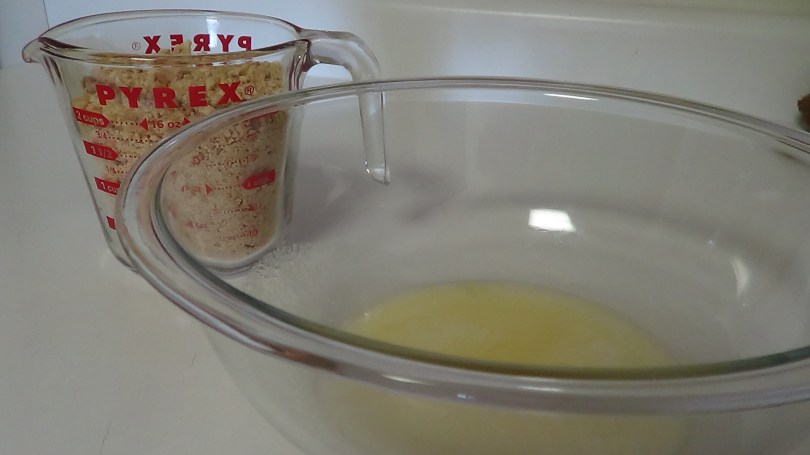 Melt the butter in the microwave for 55 seconds. Add two cups of graham cracker crumbs.