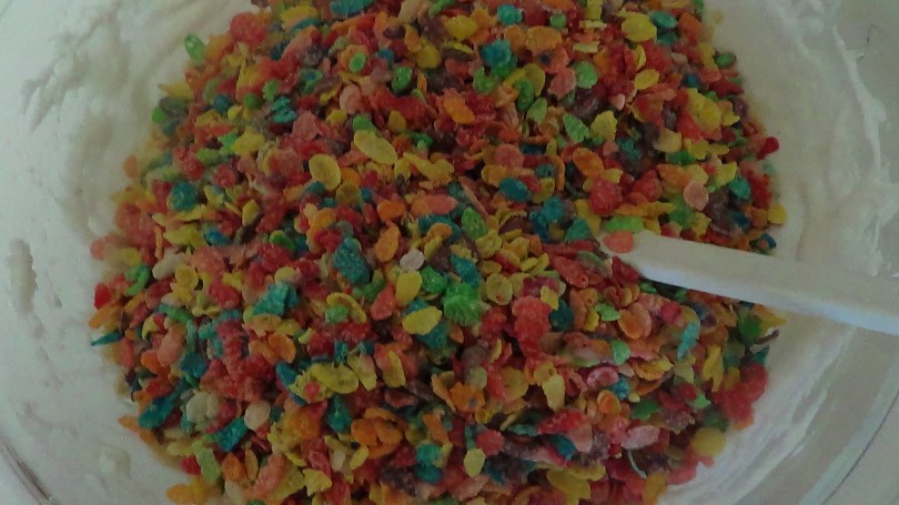 Add the Fruity Pebbles and Rice Krispies.