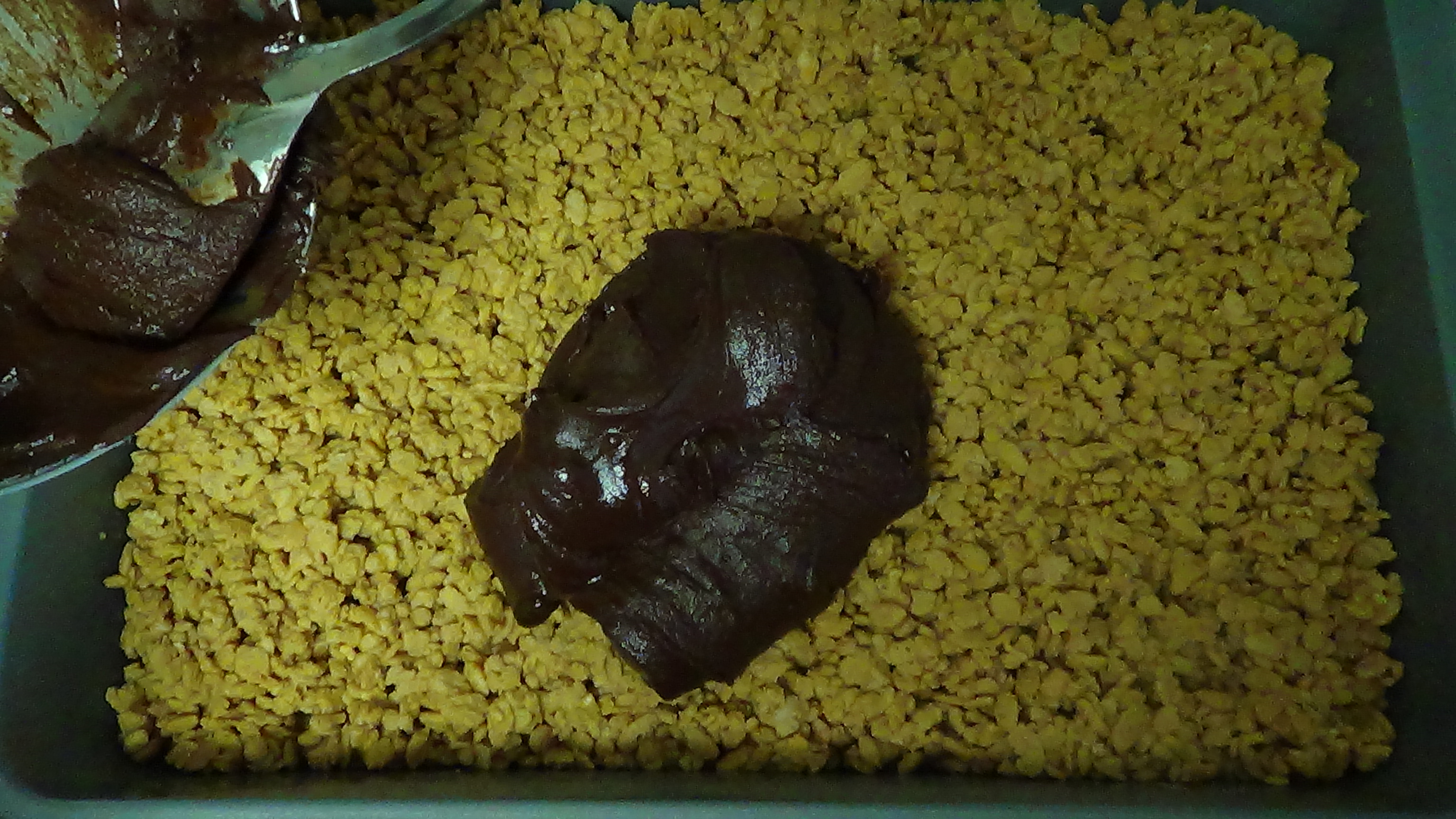 Carefully spread the chocolate over the bottom layer of the Rice Krispies.